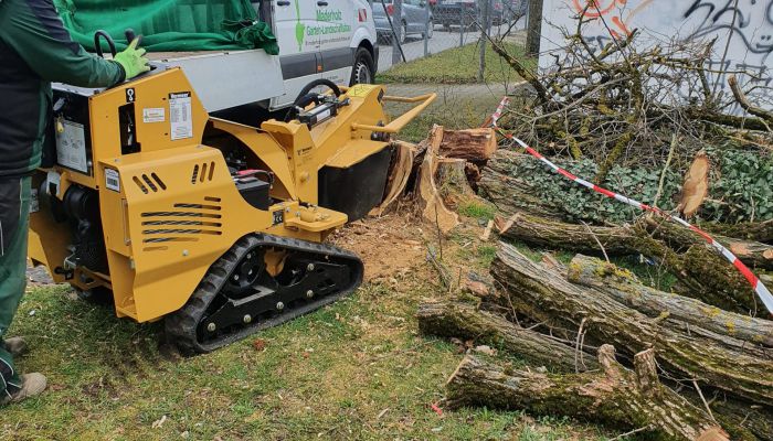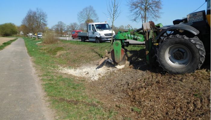 Mit unserer leistungsstarken Wurzelfräse, auch Stubbenfräse genannt, die nur eine Durchfahrtsbreite von 100 cm benötigt, kommen wir in (fast) jeden Garten hinein. Auch in Ihren. Wurzelfräsen ist im Normalfall günstiger als die Wurzel anderweitig zu roden. Beim Wurzeln entfernen bedarf es leistungsstarker Technik. Mit einer modernen Spezialmaschine entfernen wir Baumstümpfe jeder Art. Wir benutzen eine selbstfahrende Wurzelfräse mit Minibaggeranbau, die sich besonders gut eignet für Baustellen mit beengten Platzverhältnissen so wie in Parks, auf Friedhöfen, in Gärten oder Gelände, auf dem wenig Platz vorhanden ist. Durch das Fräsen bis zu einer Tiefe von maximal 0,80 Meter wird es möglich, an gleicher Stelle Neupflanzungen vorzunehmen.